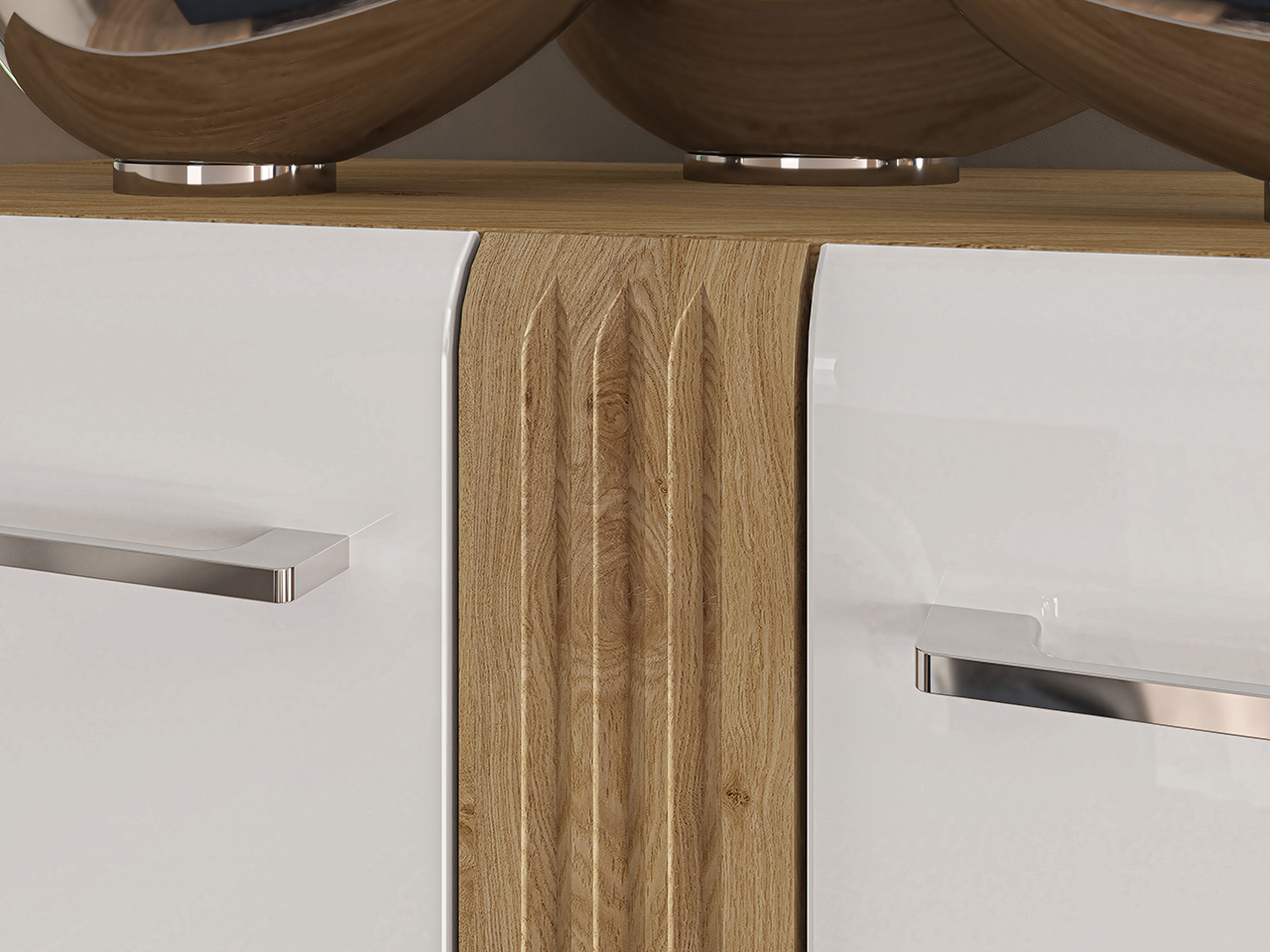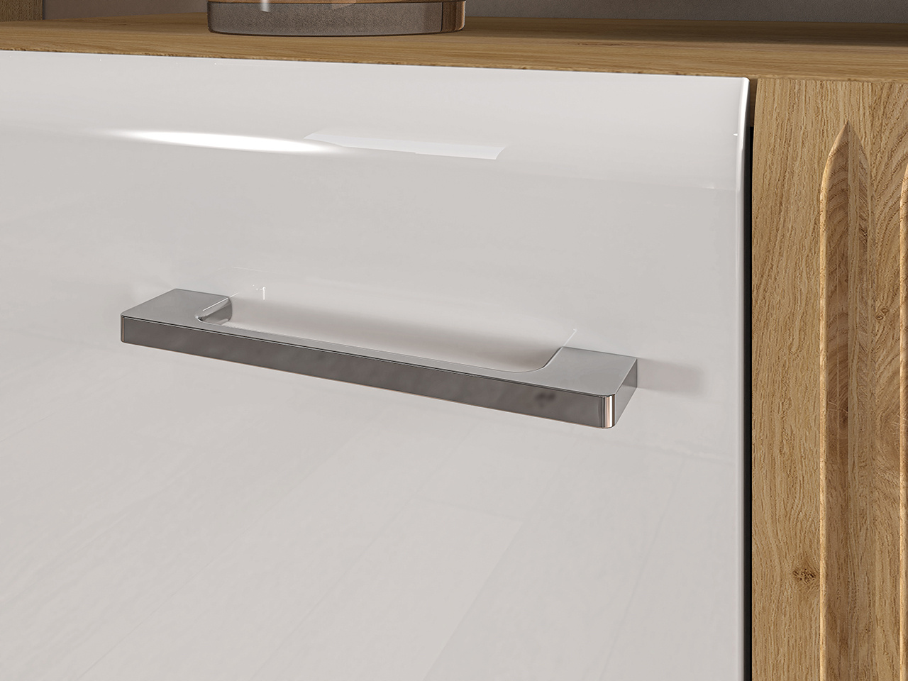 Korpus sektoru ADAGIO je vyroben z kvalitního lamina v dekoru dub castello. Čela skříněk a šuplíků jsou z MDF bílé barvy ve vysokém lesku. Dekorativní drážkovaná lišta je z MDF v dekoru dub castello. Všechny skříňky jsou vybaveny systémem tichého dovírání. Pojezdy šuplíků mají plný výsuv s tichým dojezdem. LED osvětlení skleněných polic u vitrín si můžete doobjednat za příplatek.