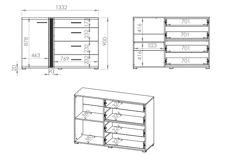 Komoda kombinovaná ADAGIO 04 - kombinovaná, s plnými dvířky, za kterými se ukrývá jedna police a čtyři šuplíky