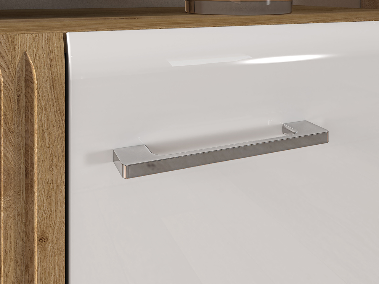 Korpus sektoru ADAGIO je vyroben z kvalitního lamina v dekoru dub castello. Čela skříněk a šuplíků jsou z MDF bílé barvy ve vysokém lesku. Dekorativní drážkovaná lišta je z MDF v dekoru dub castello. Všechny skříňky jsou vybaveny systémem tichého dovírání. Pojezdy šuplíků mají plný výsuv s tichým dojezdem. LED osvětlení skleněných polic u vitrín si můžete doobjednat za příplatek.