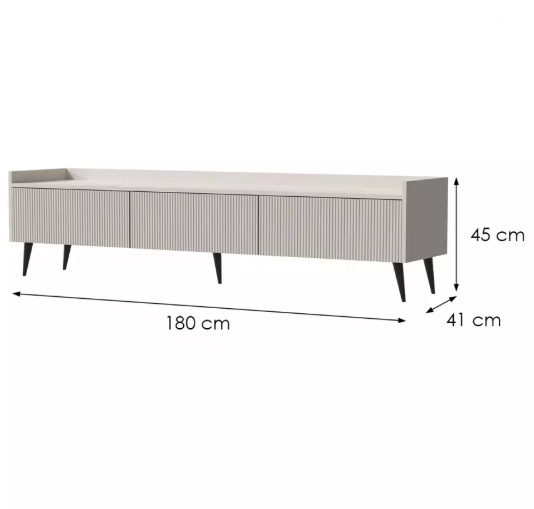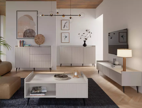 Systémový nábytek ADEMO je elegantní a funkční nábytek pro každý obývací pokoj. Korpus nábytku je vyroben z kvalitního lamina, čelní plochy jsou z MDF s drážkováním. Jedinečný vzhled a vysoká praktičnost obývacího nábytku ADEMO se vyznačují jedinečným stylem a originalitou. Drážkovaný design v kombinaci s atraktivní barvou kašmír mu dodává moderní a elegantní vzhled. Tento sektor do obývacího pokoje je perfektním řešením pro Vás, kdo hledáte vizuálně atraktivní prvky interiérového designu. Všestranný nábytek s nádechem sofistikovanosti s drážkovanými čely se perfektně hodí do moderního interiéru. Jeho minimalistické, hladké linie nezahlcuje prostor a umožňují všestranné uspořádáni obytného prostoru. S obývacím systémovým nábytkem ADEMO si můžete vytvořit elegantní a hřejivý interiér.