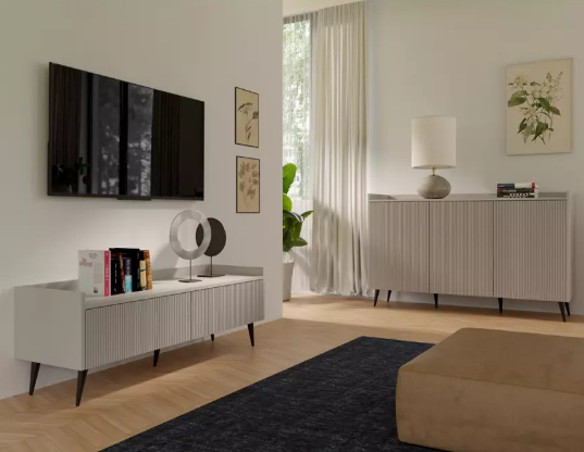 Systémový nábytek ADEMO je elegantní a funkční nábytek pro každý obývací pokoj. Korpus nábytku je vyroben z kvalitního lamina, čelní plochy jsou z MDF s drážkováním. Jedinečný vzhled a vysoká praktičnost obývacího nábytku ADEMO se vyznačují jedinečným stylem a originalitou. Drážkovaný design v kombinaci s atraktivní barvou kašmír mu dodává moderní a elegantní vzhled. Tento sektor do obývacího pokoje je perfektním řešením pro Vás, kdo hledáte vizuálně atraktivní prvky interiérového designu. Všestranný nábytek s nádechem sofistikovanosti s drážkovanými čely se perfektně hodí do moderního interiéru. Jeho minimalistické, hladké linie nezahlcuje prostor a umožňují všestranné uspořádáni obytného prostoru. S obývacím systémovým nábytkem ADEMO si můžete vytvořit elegantní a hřejivý interiér.