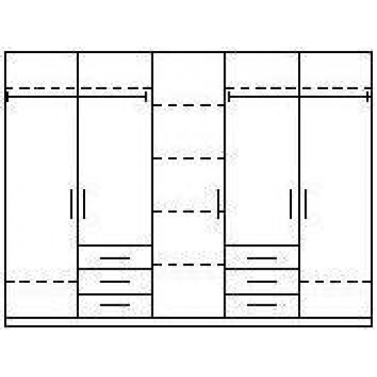 V základním provedení je skříň vybavená policemi + šuplíky + šatní tyčí + zrcadly, viz rozkres.