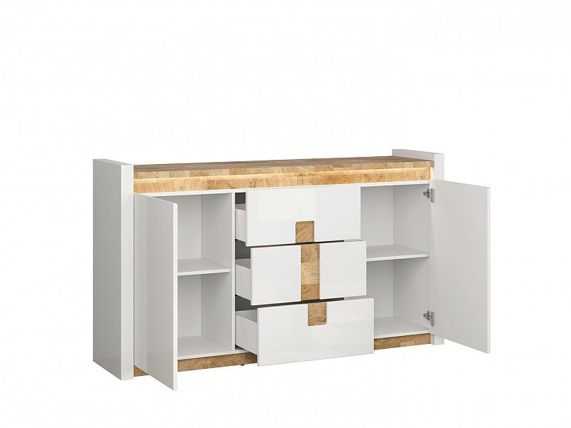 Komoda je dvoudvířková s poličkami a třemi objemnými šuplíky uprostřed