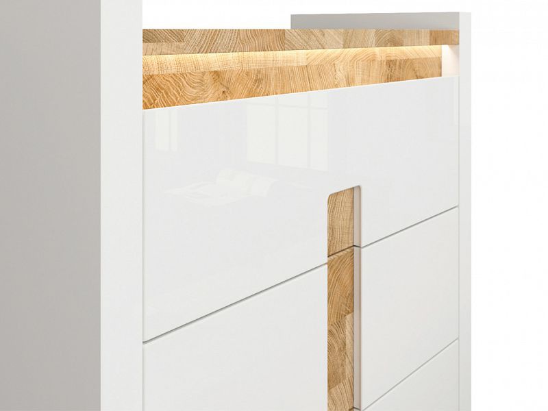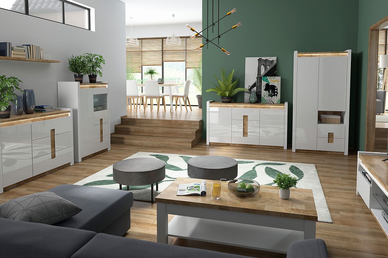 Sektor ALAMEDA je díky bílé barvě ve vysokém lesku a elegantní kombinaci s dubem westminster jedinečný systémový nábytek k zařízení moderního obývacího pokoje. Velmi luxusním dojmem působí originální detaily a zesílené vrchní a boční desky. Tento atraktivní nábytek se stane originální součástí Vašeho obývacího pokoje. Vysoký komfort užívání zajišťují panty s tichým dovíráním a LED osvětlení pod horní deskou.