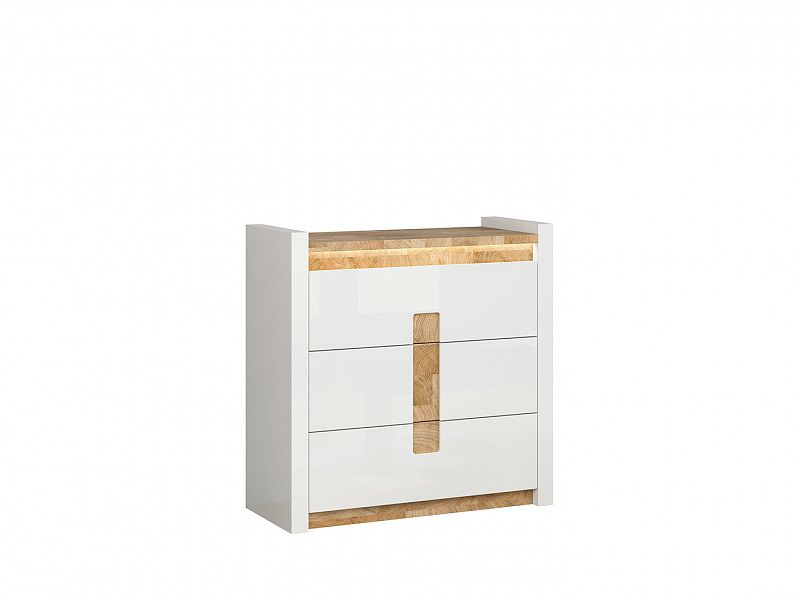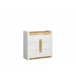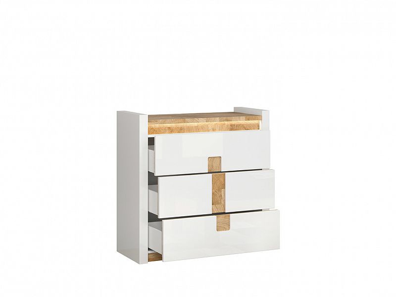 Modulový nábytek ALAMEDA je vyroben z kvalitního lamina, boční a horní desky jsou zesíleny. Korpus je v bílý, dvířka v bílém vysokém lesku, čela šuplíků v bílém lesku s detaily v dekoru dub westmister, horní deska a spodní lišta jsou rovněž v dubu westmister. Pod horní deskou je umístěno efektní LED osvětlení.