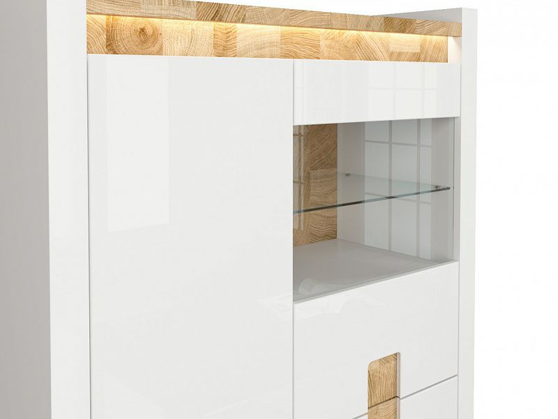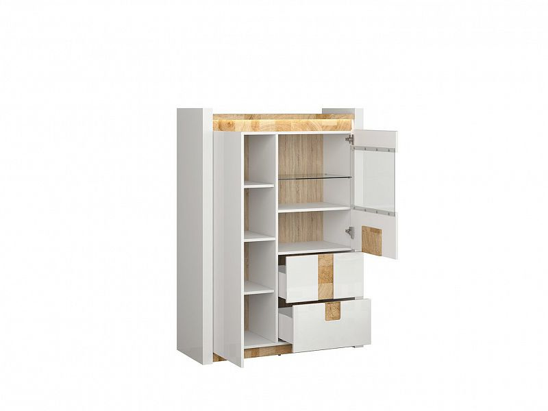 Sektor ALAMEDA je díky bílé barvě ve vysokém lesku a elegantní kombinaci s dubem westminster jedinečný systémový nábytek k zařízení moderního obývacího pokoje. Velmi luxusním dojmem působí originální detaily a zesílené vrchní a boční desky. Tento atraktivní nábytek se stane originální součástí Vašeho obývacího pokoje. Vysoký komfort užívání zajišťují panty s tichým dovíráním a LED osvětlení pod horní deskou.