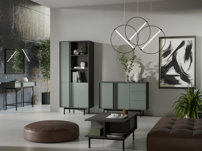ALSY systémový nábytek do obývacího pokoje. Vkusný, jednoduchý, elegantní. Moderní nábytek do obývacího pokoje ALSY vyniká nadčasovým, minimalistickým designem, který dokonale splňuje náročné interiérové požadavky. Hladké linie a jedinečná kombinace antracitové barvy a aloe vera vytvářejí silný dekorativní prvek. Široké možnosti uspořádání, které tato sada nábytku do obývacího pokoje nabízí, jí dodávají všestranný a univerzální charakter, který se hodí do moderních i klasických interiérů. Výběr nábytku není určen pouze jeho vzhledem, ale také jeho funkčností. Moderní sektorový nábytek do obývacího pokoje ALSY je vyroben z vysoce kvalitních materiálů, což zaručuje jeho trvanlivost, pevnost a vysokou odolnost proti poškození. Poskytuje dostatek úložného prostoru, pomáhá optimalizovat a pohodlně organizovat prostor a přizpůsobuje se Vašim individuálním potřebám.