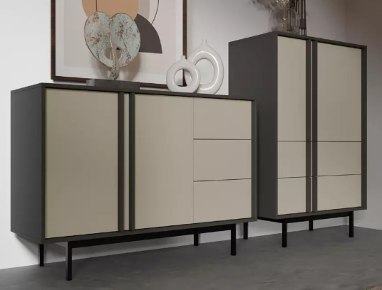ALSY systémový nábytek do obývacího pokoje. Vkusný, jednoduchý, elegantní. Moderní nábytek do obývacího pokoje ALSY vyniká nadčasovým, minimalistickým designem, který dokonale splňuje náročné interiérové požadavky. Hladké linie a jedinečná kombinace antracitové a světle béžové barvy, vytvářejí silný dekorativní prvek. Široké možnosti uspořádání, které tato sada nábytku do obývacího pokoje nabízí, jí dodávají všestranný a univerzální charakter, který se hodí do moderních i klasických interiérů. Výběr nábytku není určen pouze jeho vzhledem, ale také jeho funkčností. Moderní sektorový nábytek do obývacího pokoje ALSY je vyroben z vysoce kvalitních materiálů, což zaručuje jeho trvanlivost, pevnost a vysokou odolnost proti poškození. Poskytuje dostatek úložného prostoru, pomáhá optimalizovat a pohodlně organizovat prostor a přizpůsobuje se Vašim individuálním potřebám.