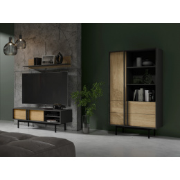 ALSY systémový nábytek do obývacího pokoje. Vkusný, jednoduchý, elegantní. Moderní nábytek do obývacího pokoje ALSY vyniká nadčasovým, minimalistickým designem, který dokonale splňuje náročné interiérové požadavky. Hladké linie a jedinečná kombinace antracitové barvy a olejovaný dub vytvářejí silný dekorativní prvek. Široké možnosti uspořádání, které tato sada nábytku do obývacího pokoje nabízí, jí dodávají všestranný a univerzální charakter, který se hodí do moderních i klasických interiérů. Výběr nábytku není určen pouze jeho vzhledem, ale také jeho funkčností. Moderní sektorový nábytek do obývacího pokoje ALSY je vyroben z vysoce kvalitních materiálů, což zaručuje jeho trvanlivost, pevnost a vysokou odolnost proti poškození. Poskytuje dostatek úložného prostoru, pomáhá optimalizovat a pohodlně organizovat prostor a přizpůsobuje se Vašim individuálním potřebám.