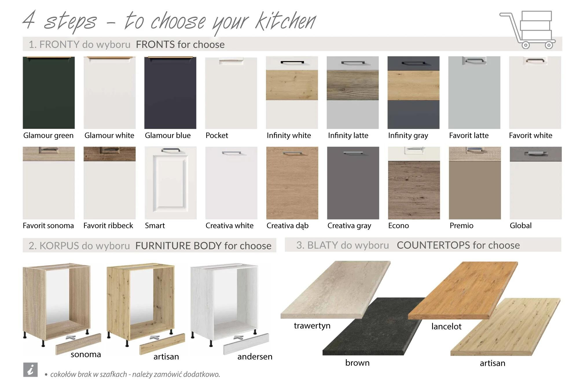 Spodní kuchyňské skříňky se dodávají bez soklu a bez pracovní desky, které si můžete vybrat z naší nabídky.