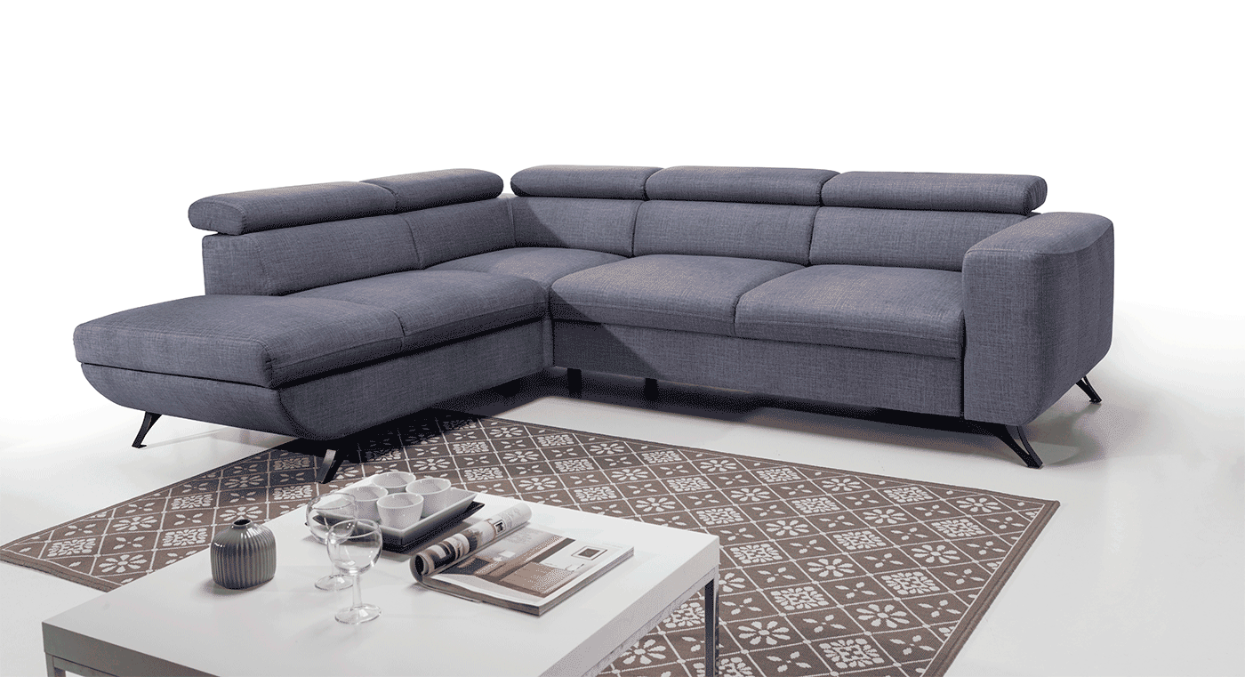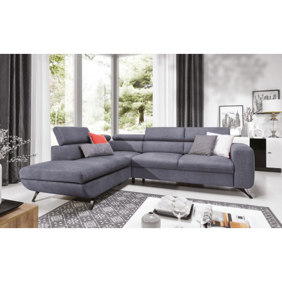 Moderní, pohodlná rohová sedací souprava. Sedačka je rozkládací s lůžkem pro denní spání a úložným prostorem pro lůžkoviny. Rohovka je vybavená moderními nástavitelnými opěrkami hlavy. Velký výběr potahových látek je samozřejmostí.