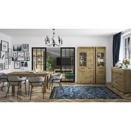 Pečlivě navržený systémový nábytek ARTIS je moderna inspirovaná přírodou. Přírodní vzor dřeva s přiznanou strukturou a výrazný vzor zdůrazňují charakter nábytku. V kombinaci s vyváženým a jednoduchým stylem je tento nábytek ideální k vytvoření originálního interiéru. Kovové úchyty v černé barvě dokonale kontrastuje s dekorem teplého dubu a podsvícená dekorativní lišta dodá Vašemu obývacímu pokoji i jídelně jedinečnou atmosféru.