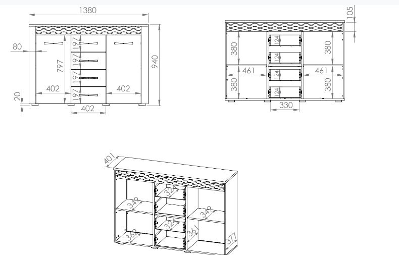 Komoda - s policemi a plnými dvířky po stranách, uprostřed čtyři šuplíky