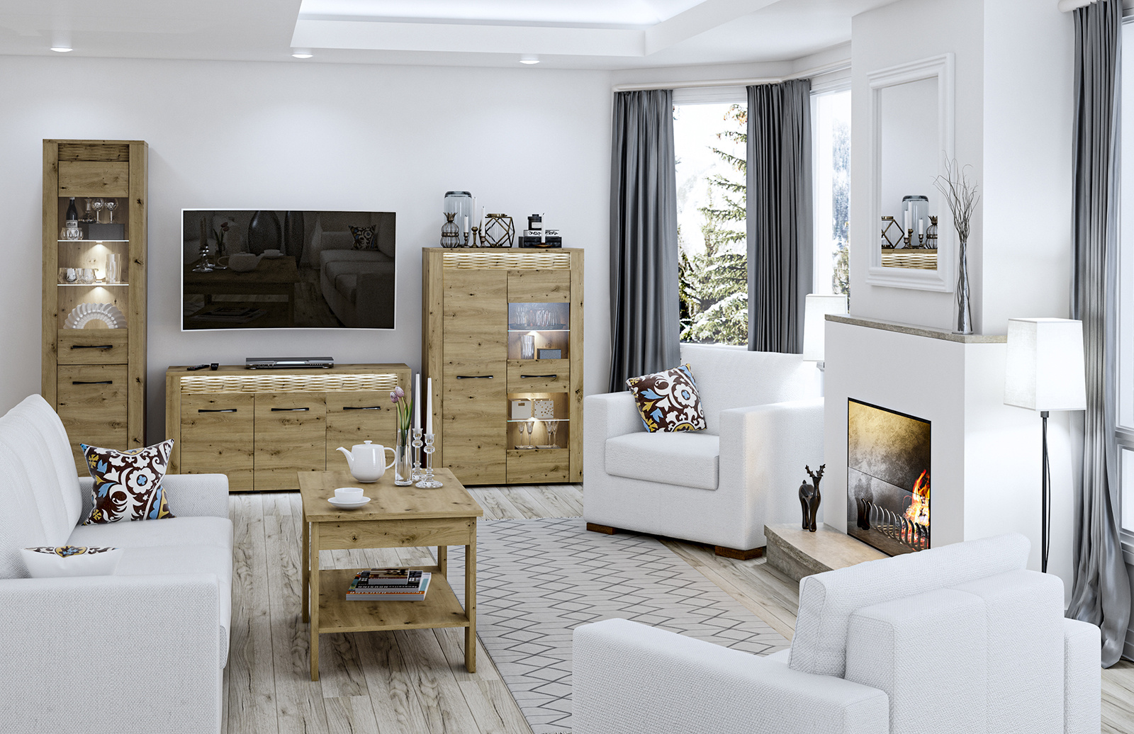 Pečlivě navržený systémový nábytek ARTIS je moderna inspirovaná přírodou. Přírodní vzor dřeva s přiznanou strukturou a výrazný vzor zdůrazňují charakter nábytku. V kombinaci s vyváženým a jednoduchým stylem je tento nábytek ideální k vytvoření originálního interiéru. Kovové úchyty v černé barvě dokonale kontrastuje s dekorem teplého dubu a podsvícená dekorativní lišta dodá Vašemu obývacímu pokoji i jídelně jedinečnou atmosféru.