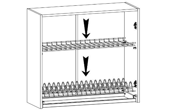 Horní skříňka kuchyně ASPEN G80C - skříňka má místo klasických police a dna drátěné držáky s odkapávací miskou na talíře.