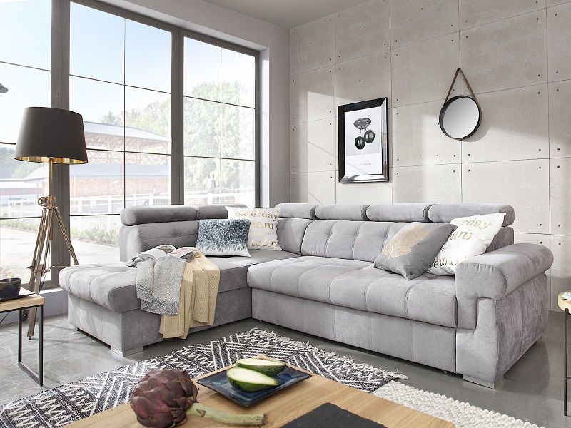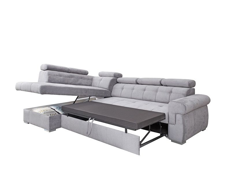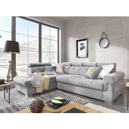 Rohová sedací souprava ATLANTIDA s výškově stavitelnými podhlavníky. Sedačka je rozkládací s úložným prostorem. Po rozkladu vznikne plocha pro příležitostné spaní o rozměrech 120 x 200 cm. Na výběr máte pravou nebo levou variantu rohu. Sedací souprava je očalouněna světle šedou látkou Gusto 82, včetně zad sedačky, můžete ji umístit do prostoru. Pohodlí při sezení podpoří polohovatelné opěrky hlavy. Výška sedačky je podle sklopení opěrek hlavy 85 až 100 cm. Sedák je vyplněný studenou HR pěnou a vlnitou pružinou. Možno zvlášť doobjednat i taburet (š. 90 cm, v. 44 cm, hl. 55 cm) ve stejné potahové látce, cena na dotaz u prodejce.