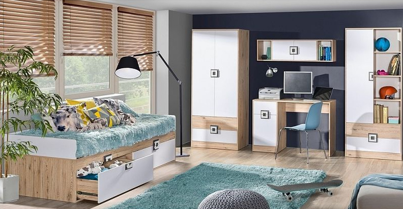 BAFRA je praktický nábytkový systém v atraktivním barevném provedení dub světlý v kombinaci s bílou s barevnými úchyty. Oceňujete minimalismus a jednoduché tvary, pak je tento nábytek určen pro Vás. Hladké čelní plochy, kovové válečkové pojezdy šuplíků, barevné úchyty - dub světlý, růžová, šedá, tyrkysová. K dispozici máte 14 prvků, které Vám umožní lehce a moderně zařídit studentský nebo dětský pokoj.