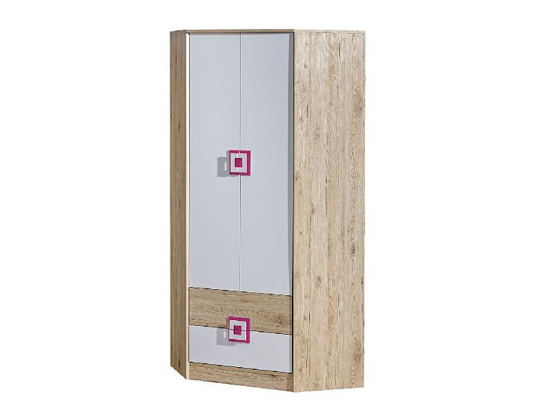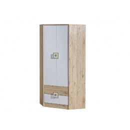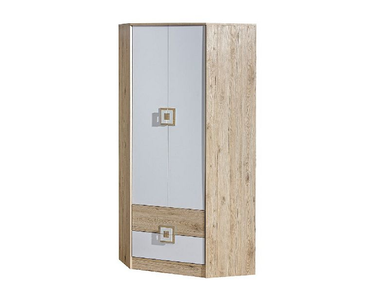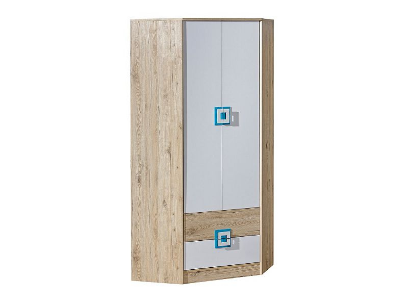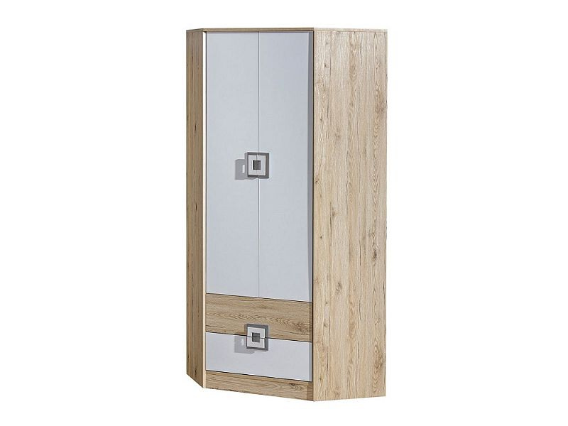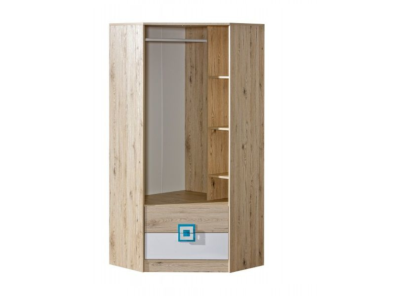 Rohová kombinovaná šatní skříň ze systému BAFRA - dvou dveřová s policemi, šatní tyčí a šuplíky