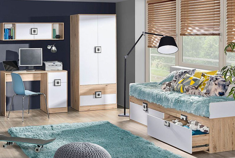 BAFRA je praktický nábytkový systém v atraktivním barevném provedení dub světlý v kombinaci s bílou s barevnými úchyty. Oceňujete minimalismus a jednoduché tvary, pak je tento nábytek určen pro Vás. Hladké čelní plochy, kovové válečkové pojezdy šuplíků, barevné úchyty - dub světlý, růžová, šedá, tyrkysová. K dispozici máte 14 prvků, které Vám umožní lehce a moderně zařídit studentský nebo dětský pokoj.
