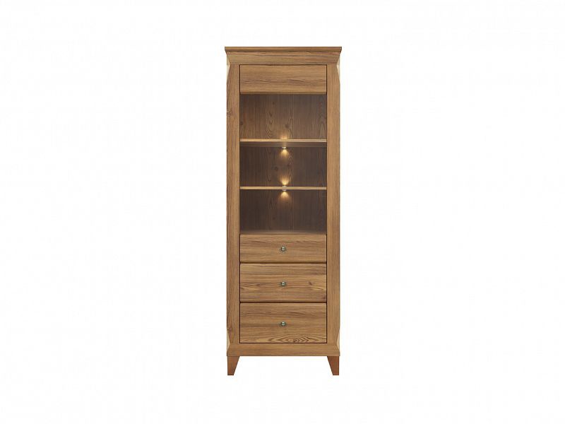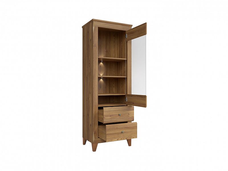 Vitrína REG1W2S ze sektoru BERGEN - dvě poličky za proskleným dvířkem jsou doplněny LED osvětlením. Zásuvky jsou umístěny na pojezdech HETTICH Quadro Silent System s tlumeným dojezdem. Panty FGV s brzdou.