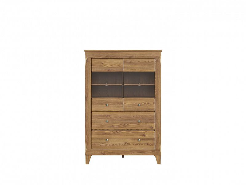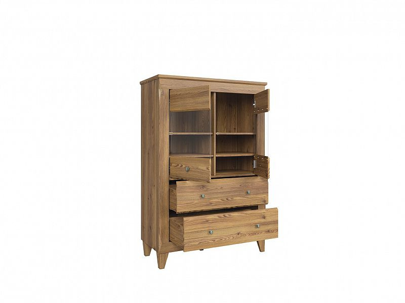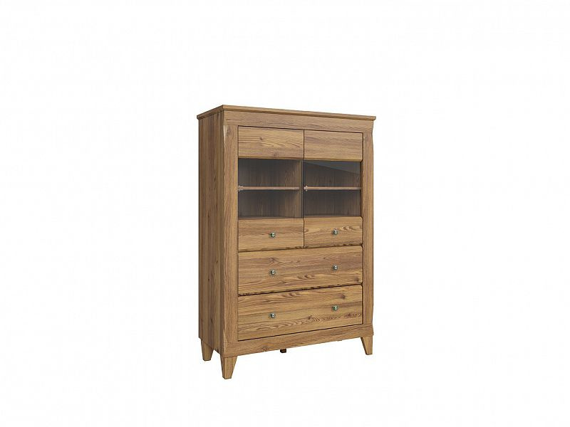 Vitrína REG2W2S ze sektoru BERGEN - za prosklenými dvířky jsou police rozděleny příčkou. Ve spodní části jsou 2 šuplíky. Dvířka jsou na pantech FGV s brzdou.