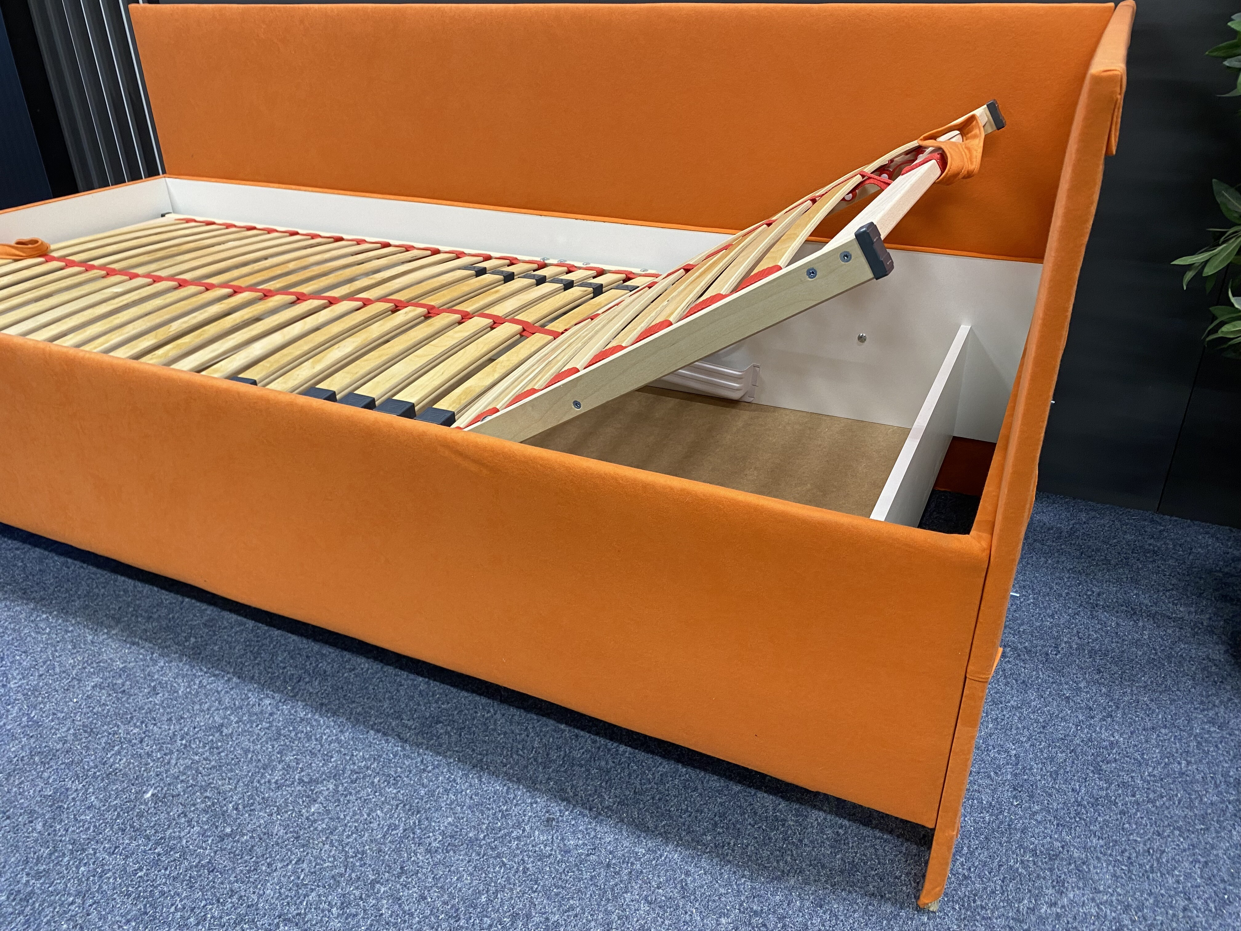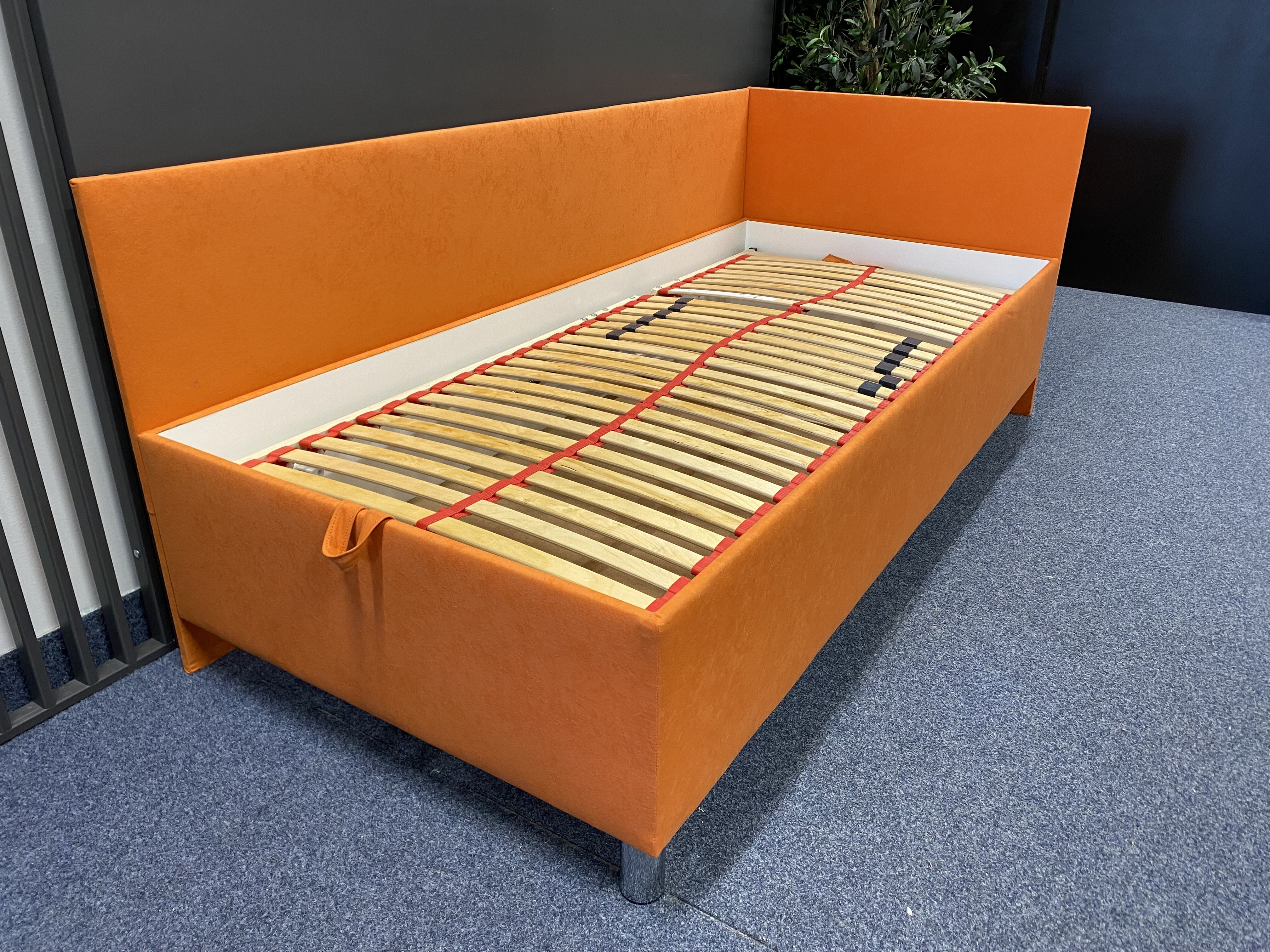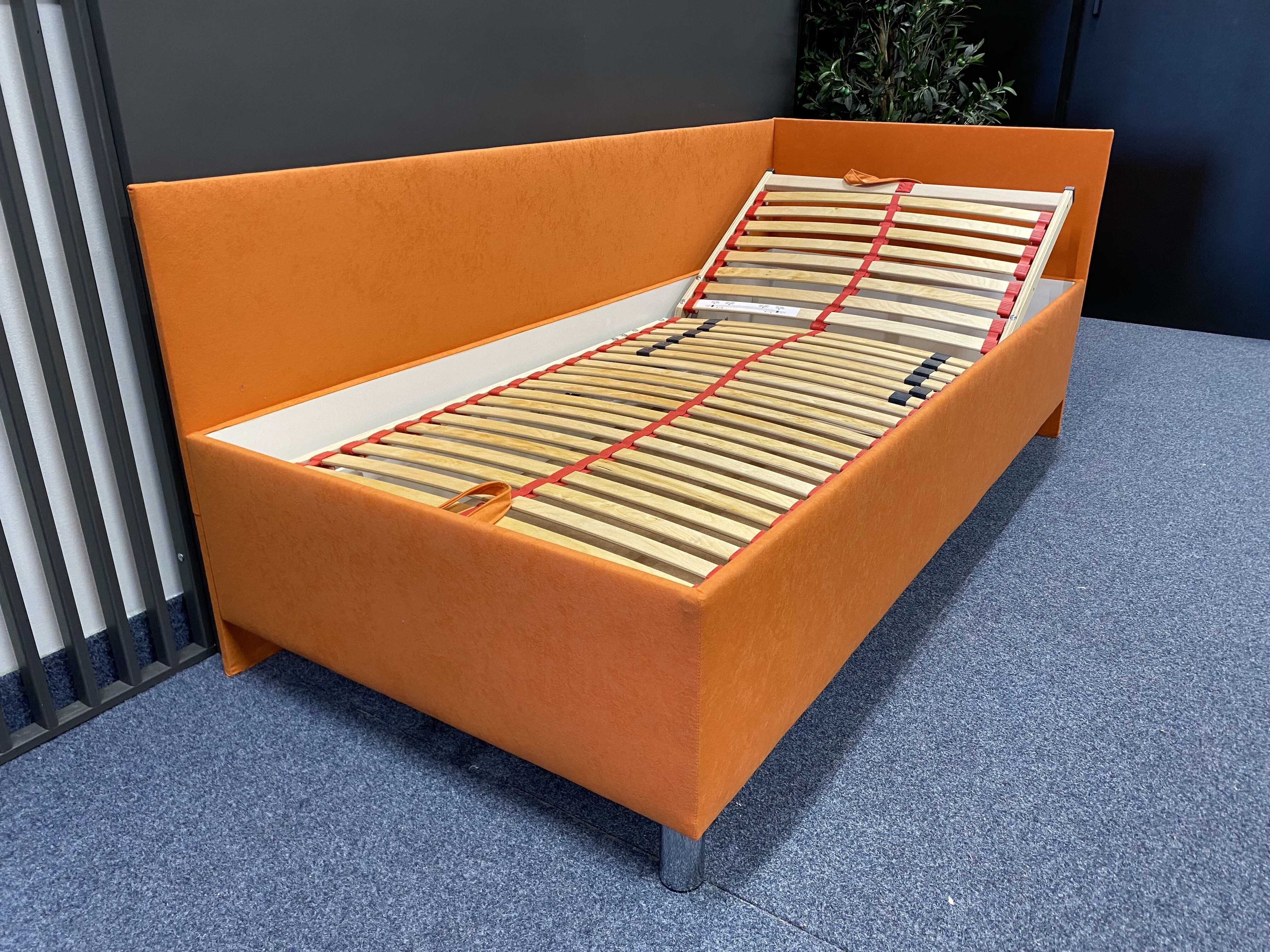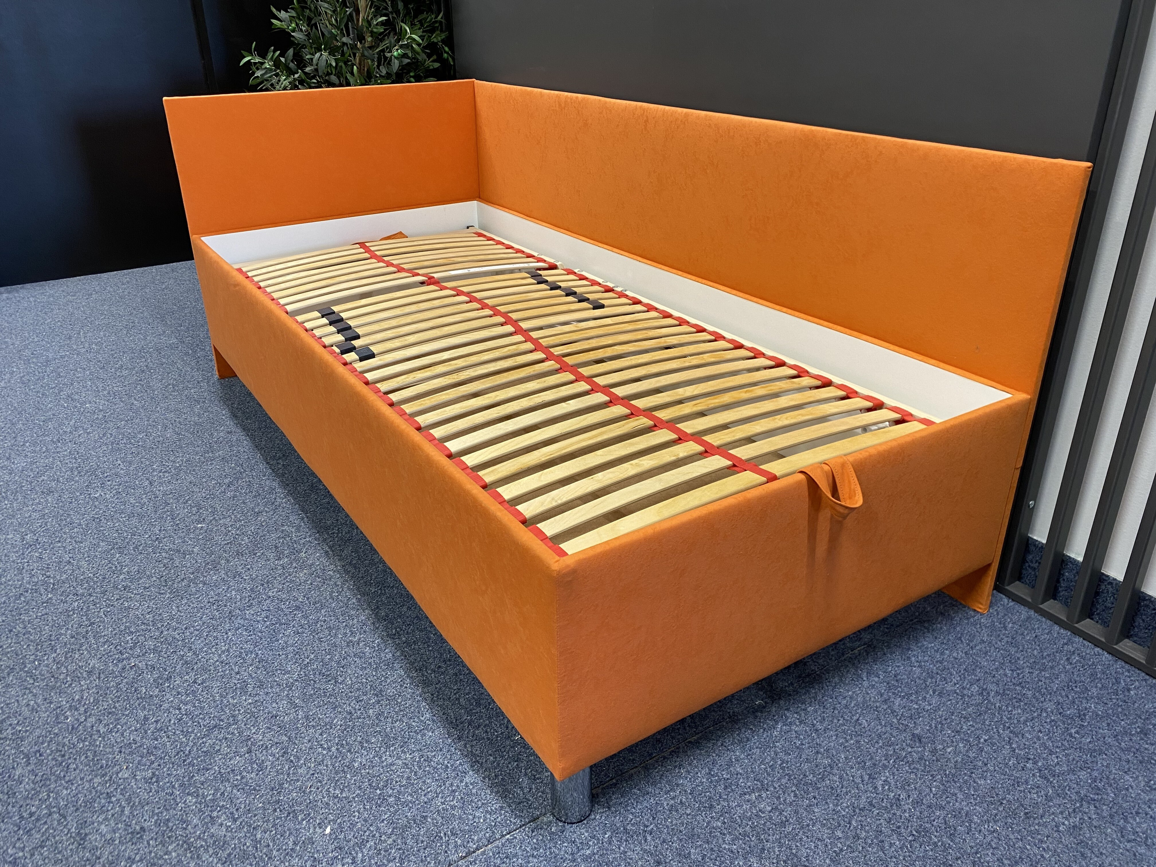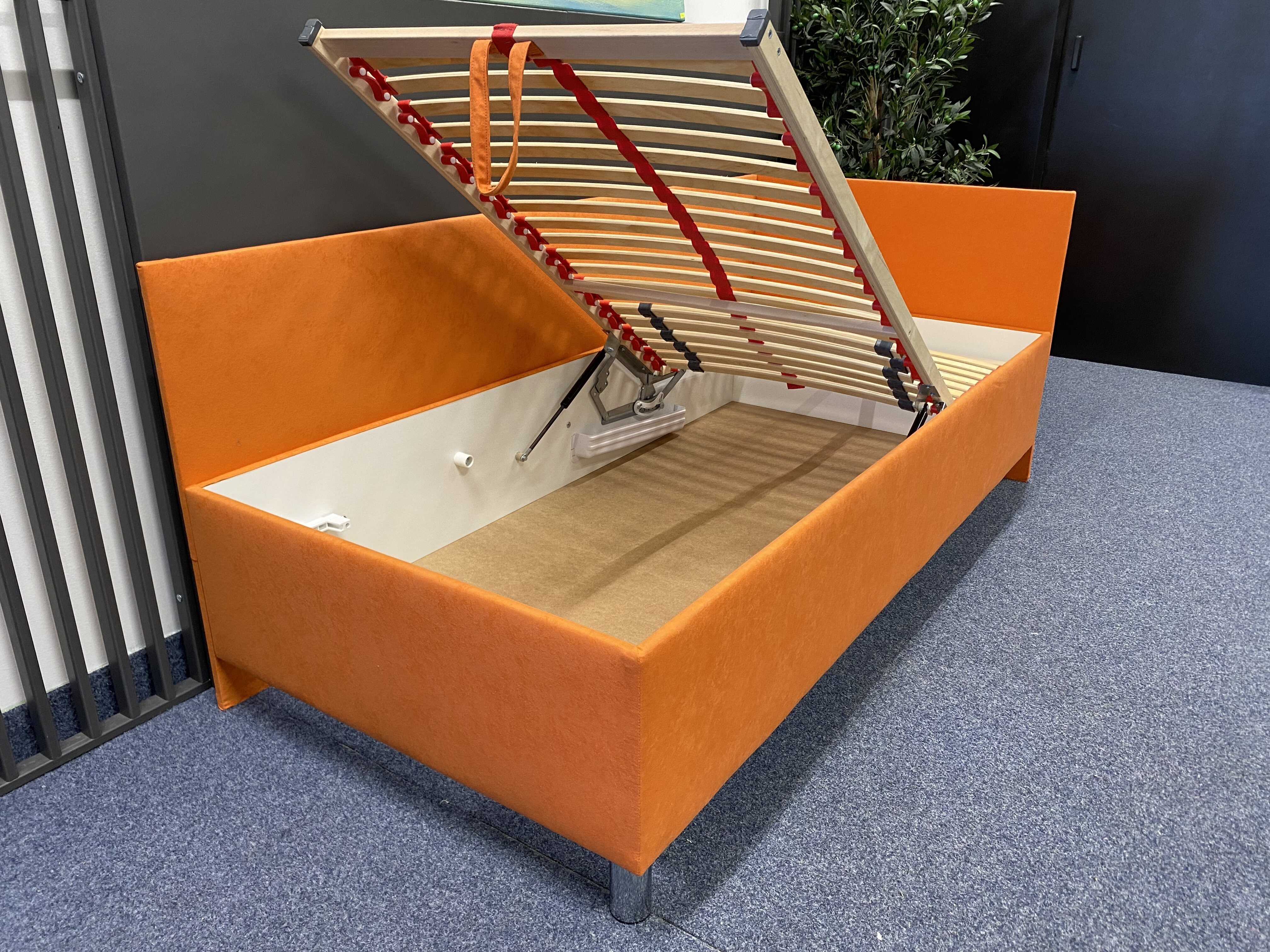 Kvalitní, zvýšená, čalouněná postel RYAN s polohovacím lamelovým roštem, 28 lamel, nastavení tuhosti a s popruhem proti přetížení. Úložný prostor přístupný od nohou pomocí plynových pístů. Předností postele RYAN je zvýšená výška ložné plochy, která umožňuje pohodlné vstávání z postele bez namáhání kloubů. Ložná plocha postele je 90x200cm. Postel si můžete vybrat v levém nebo pravém provedení.