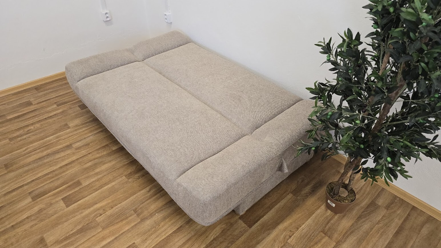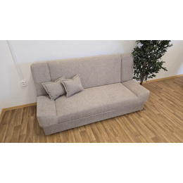 Klasická rozkládací pohovka BARI je vhodná do menších bytů. Má úložný prostor a je rozkládací, k příležitostnému přespání. Sedák má pružinové jádro. Pohovka je v béžové látce (včetně polštářků) - viz.foto.
