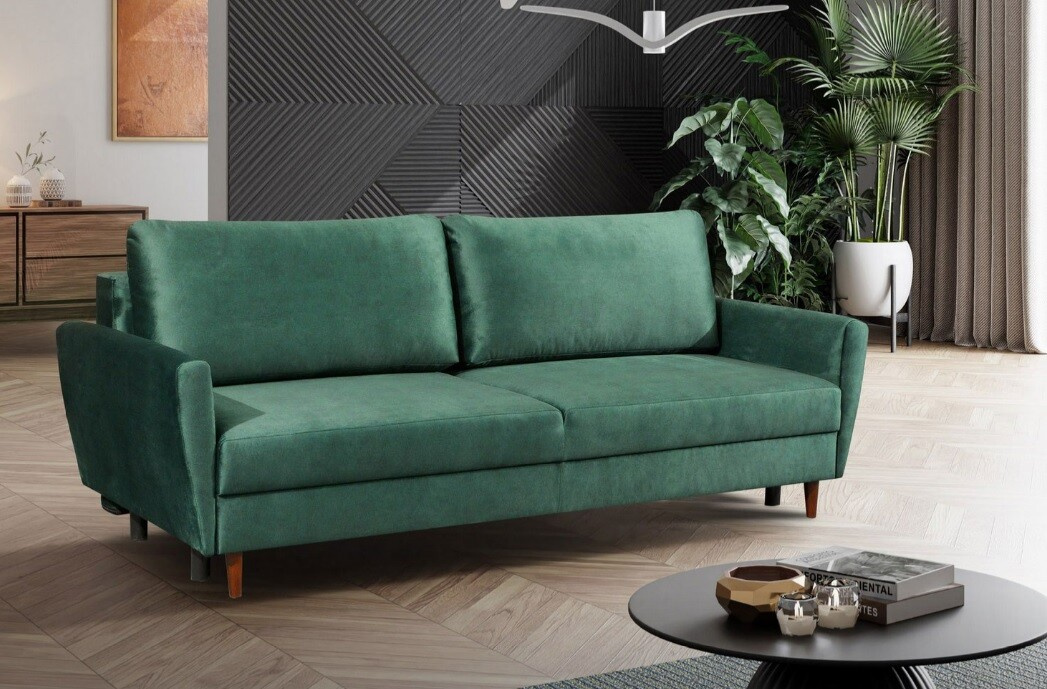 Moderní , pohodlná rozkládací pohovka s úložným prostorem je vhodná do obývacích i studentských pokojů. Čalouněnou výplň tvoří kvalitní pěna položená na vlnitých pružinách. Pohovka obsahuje moderní systém rozkládání (tzv. automat), kdy stačí jednoduše a lehce přizvednout sedací část a posunout jí dopředu. Zadní část se pak lehce sklopí. Pohovku zdobí dřevěné nožky.