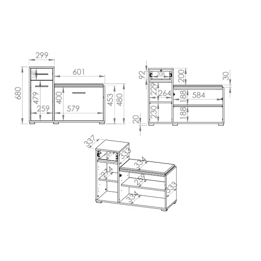 CARO 06 botník - výklopná dvířka, jedna police, čalouněný sedák, navazující skříňka s dvířky, jednou poličkou a šuplíkem