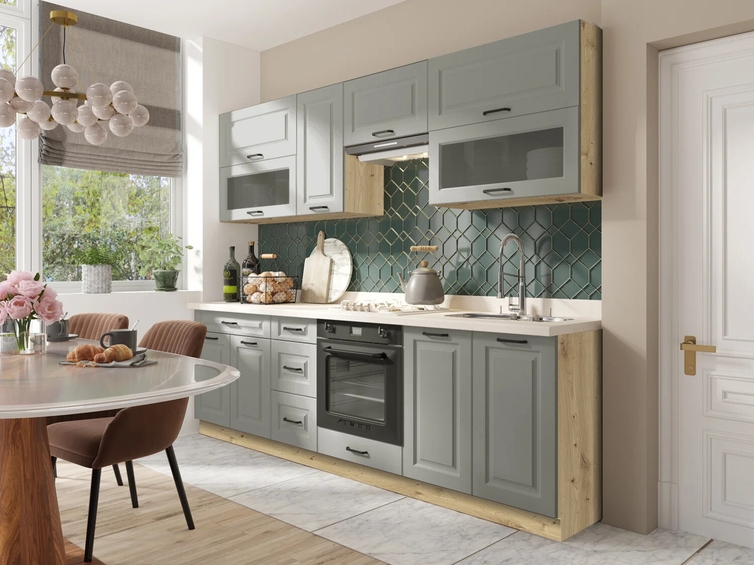 LUX - s příplatkem - šuplíky s technicky dokonalejšími pojezdy HAFELEs. Výklopná dvířka s písty Blum s nastavením zvedací síly. Tlumiče pro tiché dovírání. Závěsy skříněk se zpomalovačem. Výškově regulovatelné spodní nožky. Nastavitelný závěs pro horní skříňky.