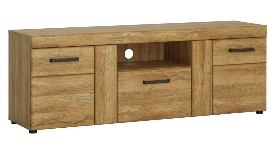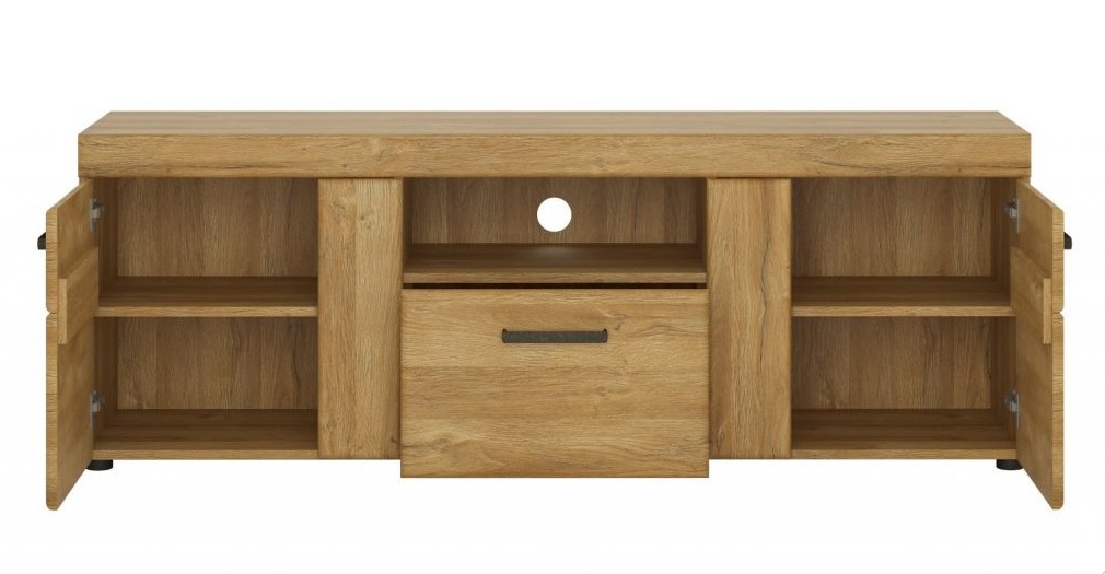 Televizní stolek - po stranách dvířka a police, uprostřed šuplík a otevřená odkládací nika