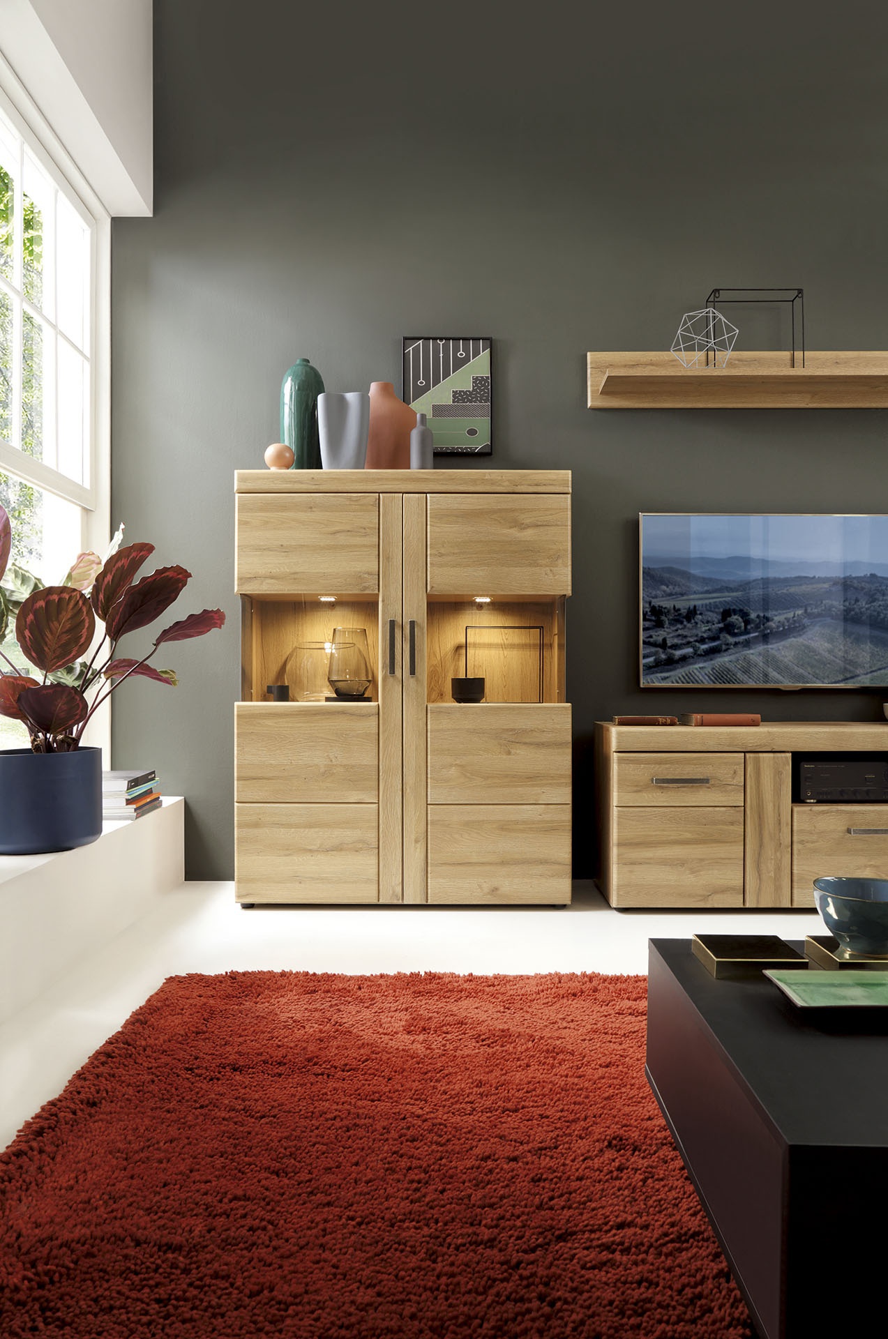 Elegantní a praktický systémový nábytek CORTINA. Nábytek můžete požít k vybavení obývacího pokoje, jídelny i předsíně. Sektor CORTINA je vyroben z kvalitního lamina - korpusy a MDF s PVC folíí - dvířka a čela šuplíků, v nadčasovém barevném provedení dub grandson. Dvířka a šuplíky jsou vybaveny tichým dovíráním.