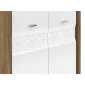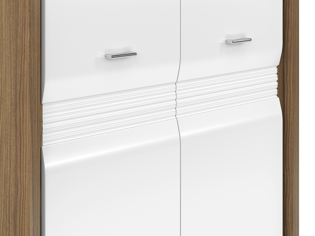 Luxusní systémový nábytek Dallas má pečlivě vybraný dekor přírodního ořechu s čelními plochami v bílém lesku, které přinášejí eleganci a svěžest do Vašeho bytu. Nábytkový systém Dallas je charakteristický horním zaoblením dvířek v MDF folii, které svým tvarem zdůrazňují jeho jedinečnost. Dalším atraktivním detailem je rýhovaná lišta horní lišta, která si můžete vybrat ve dvou odstínech - bílá nebo ořech, která je u komod a televizních stolků, s LED nasvícením. Celkový exkluzivní dojem je doplněn kovovými úchyty. Volbou nábytku DALLAS dodáte Svému interiéru eleganci a exkluzivitu.