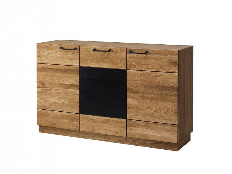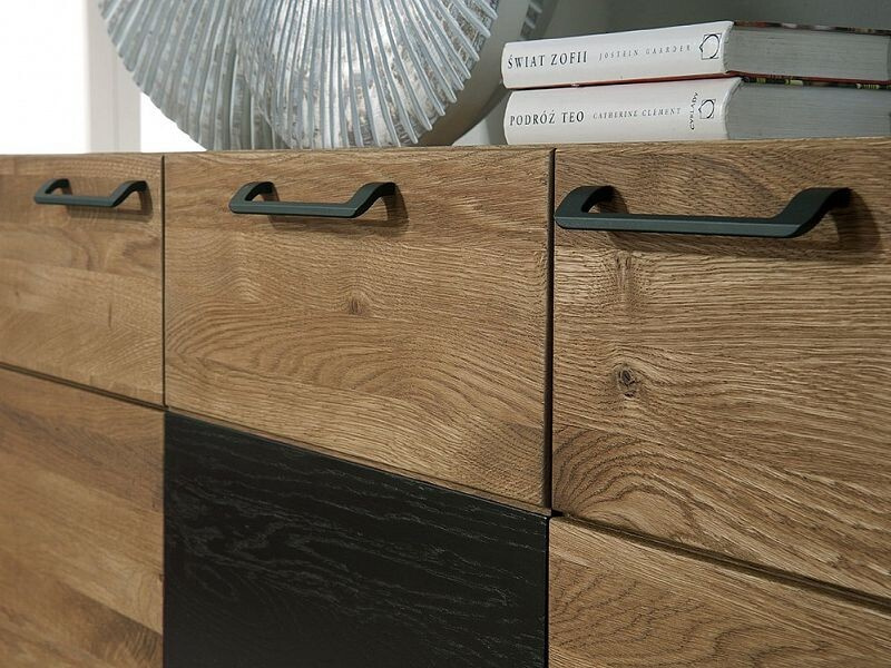DALTON, moderní, elegantní a funkční systémový nábytek vyrobený z masivního dřeva v barevném provedení dub medový / černá mat. Korpus je dýhovaný, dvířka jsou vyrobená z olejovaného, kartáčovaného masivu ( s přiznanou strukturou dřeva ), doplněná prvky z kovu v černé barvě. Tiché dovírání dvířek Slow Motion. K vitrínam je možno dokoupit LED osvětlení.