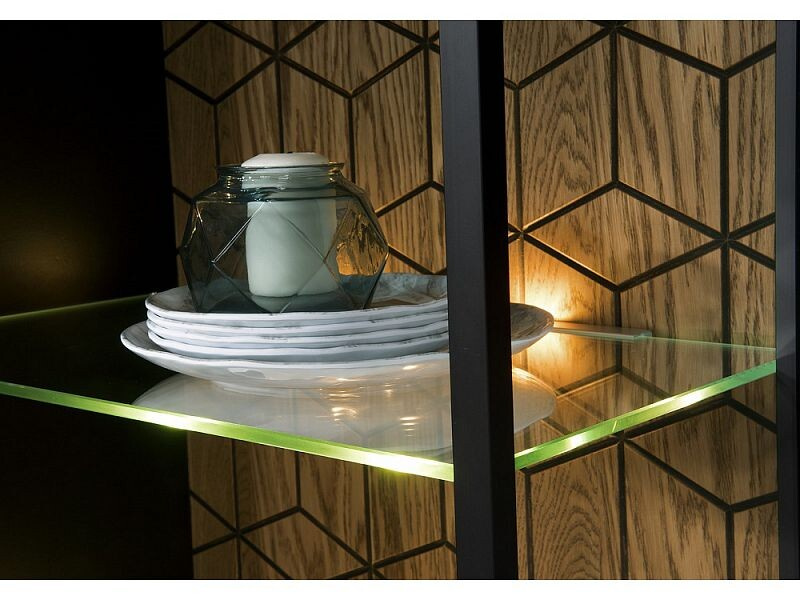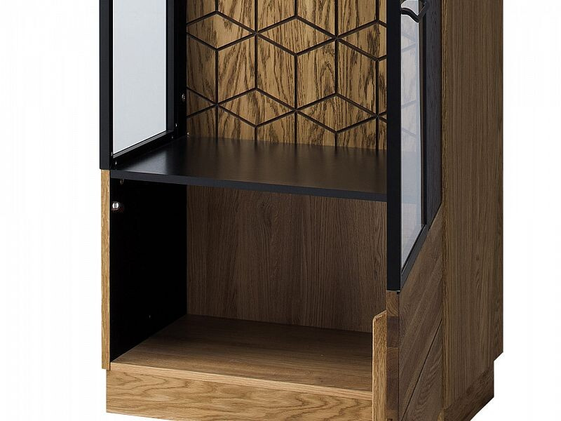 DALTON, moderní, elegantní a funkční systémový nábytek vyrobený z masivního dřeva v barevném provedení dub medový / černá mat. Korpus je dýhovaný, dvířka jsou vyrobená z olejovaného, kartáčovaného masivu ( s přiznanou strukturou dřeva ), doplněná prvky z kovu v černé barvě. Tiché dovírání dvířek Slow Motion. K vitrínam je možno dokoupit LED osvětlení.
