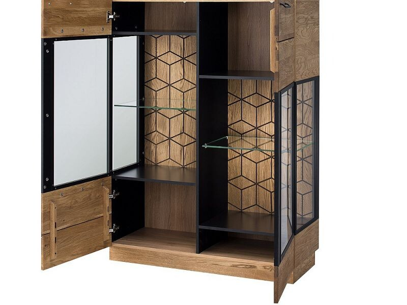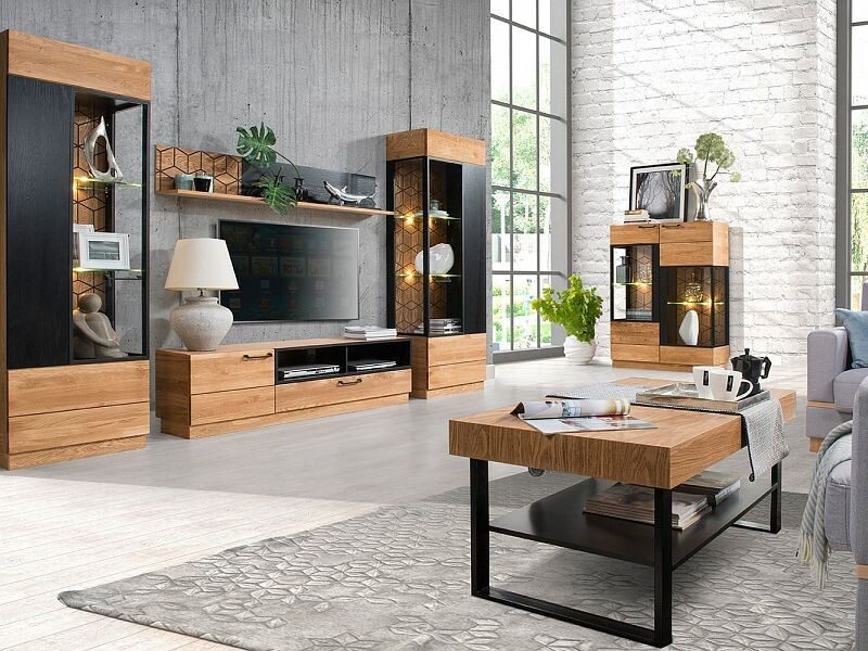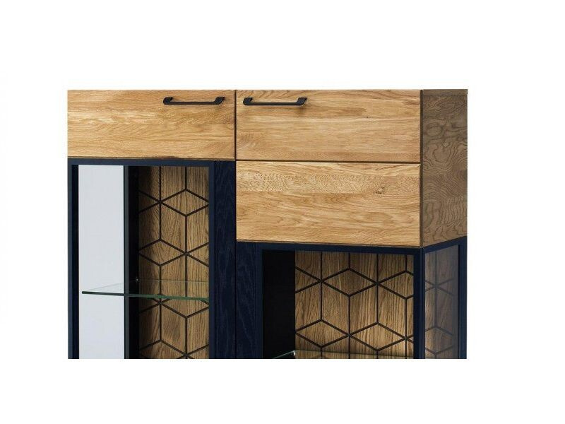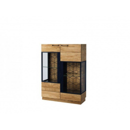 DALTON, moderní, elegantní a funkční systémový nábytek vyrobený z masivního dřeva v barevném provedení dub medový / černá mat. Korpus je dýhovaný, dvířka jsou vyrobená z olejovaného, kartáčovaného masivu ( s přiznanou strukturou dřeva ), doplněná prvky z kovu v černé barvě. Tiché dovírání dvířek Slow Motion. K vitrínám je možno dokoupit LED osvětlení.
