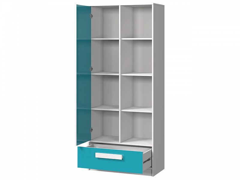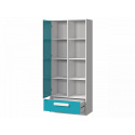 Regál DAVID 3 - polovinaplná dvířka s policemi, polovina otevřená nika s policemi a šuplíkem dole