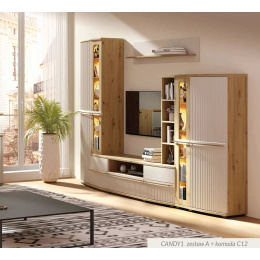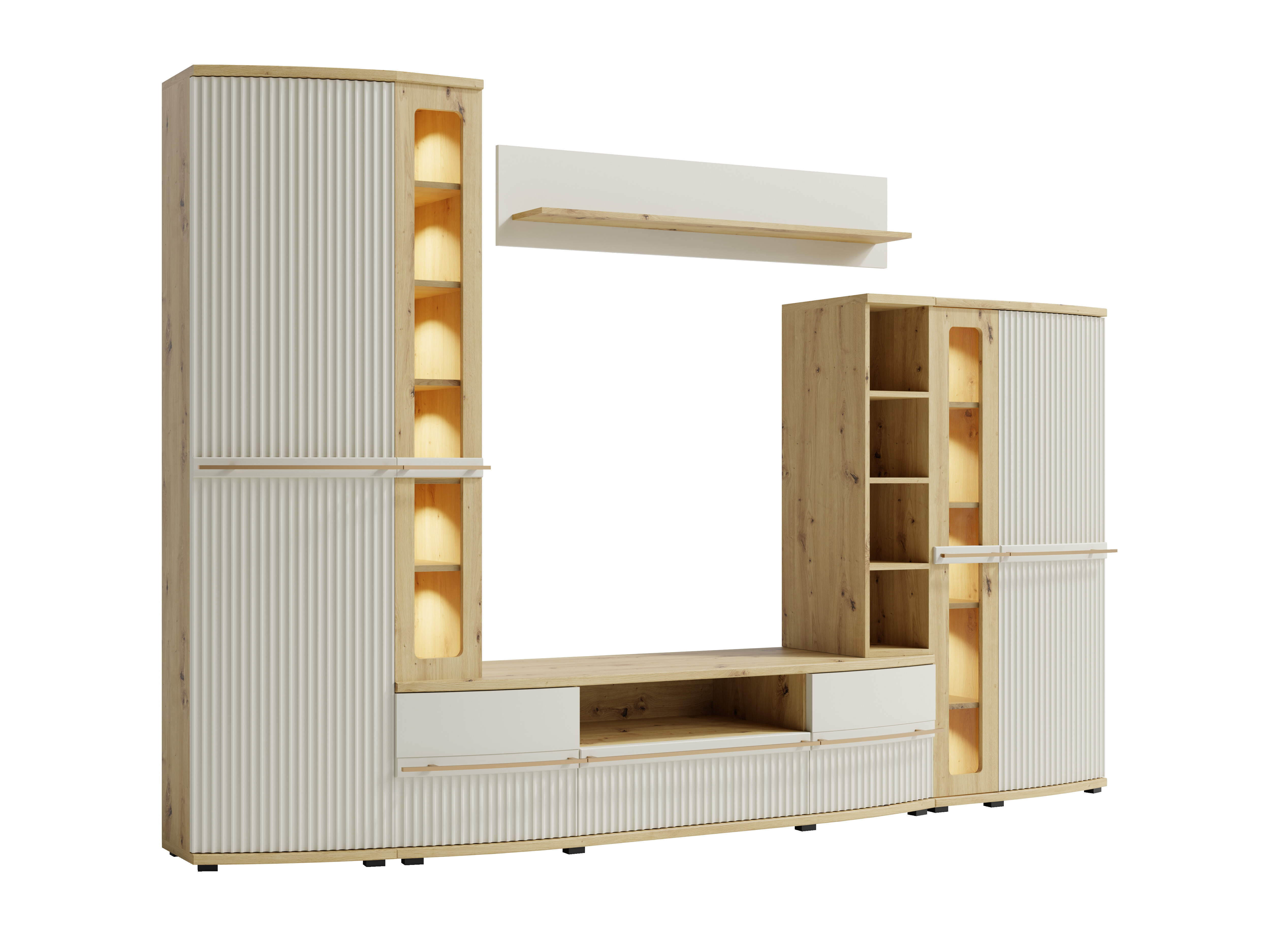 Systémový nábytek DENIS je skvělá volba pro vytvoření moderního obývacího pokoje v modním barevném provedení. Sektor DENIS se skládá ze 7 jednotlivých prvků, které můžete mezi sebou vzájemně kombinovat a vytvořit tak ideální nábytkovou sestvu. Korpus nábytku je vyroben z kvalitního lamina v dekoru artisan, čelní plochy dvířek a šuplíků jsou z MDF v bílé barvě s dekorativním frézováním. Vitríny je doplněny LED osvětlením.