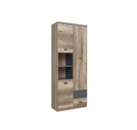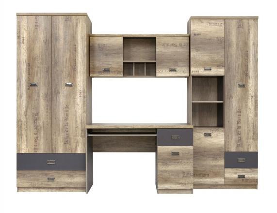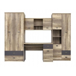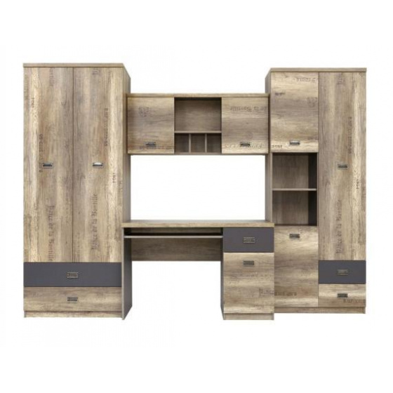 Kolekce nábytku Malcolm se opírá o nejnovější trendy v zařizování pokojů pro děti a studenty. Vyznačuje se moderním provedením dvířek a korpusů s výraznými grafickými akcenty, v barevném provedení: Dub canyon monument s 3D potiskem. Barva dřeva dub canyon monument vytváří zajímavý kontrast s moderní barvou - šedý wolfram. Na zajímavém pozadí krásně vyniknou praktické, kovové úchyty v barvě starého zlata.