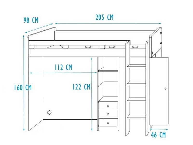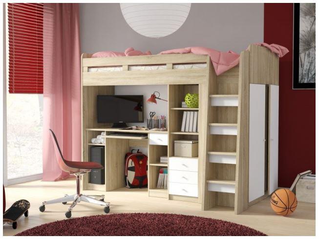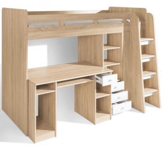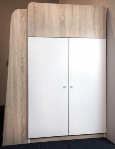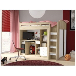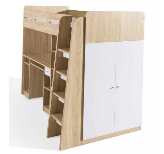 Multifunkční dětský nábytek UNIT. Sestava je kompletním řešením dětského pokoje. Nábytek je vyroben z kvalitní MDF tl. 18 a 25 mm v barevném provedení dub sonoma-bílá. Dětskou patrovou multifunkční postel lze sestavit v pravém i levém provedení.