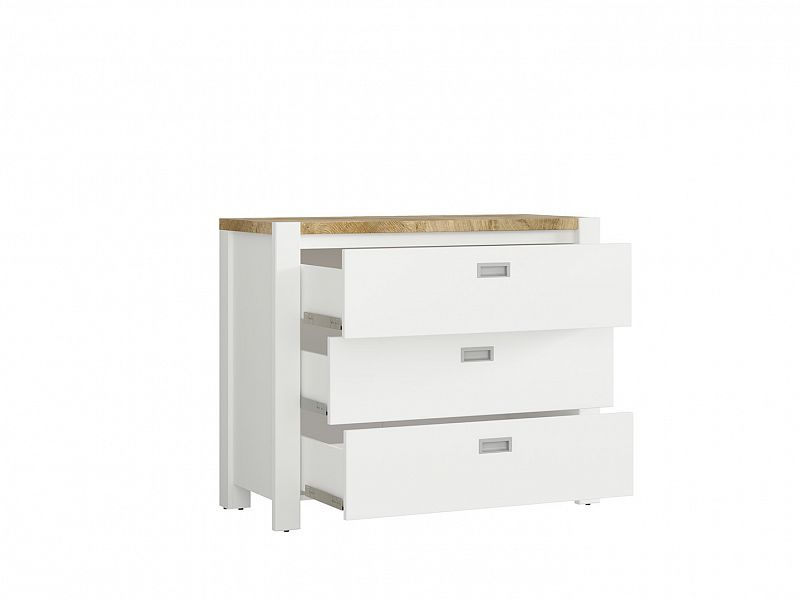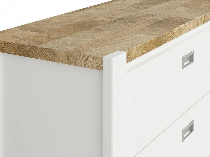 Systémový nábytek DREVISO kombinuje skandinávský styl s moderním designem. Zesílená vrchní deska a boční lišty dodají nábytku eleganci. Bílá barva kombinovaná s dubem westminster skvěle dokreslí každý interiér. Nábytek je zdobený vertikálním drážkováním na čelních stranách a zapuštěnými úchyty.