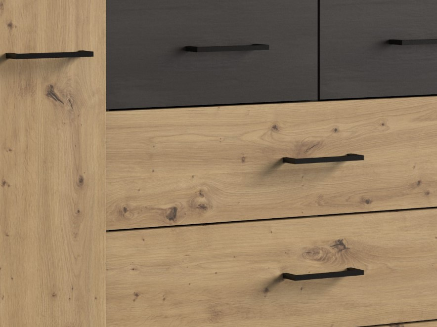 Nábytek ELBA je půvabným a okouzlujícím nábytkem ve stylovém barevném provedení dub artisan/šedá, díky kterému jednoduše zařídíte interiér vašeho domova. Design je založen na jednoduchých tvarech s výraznými rovnými liniemi. Modulový systém ELBA vás zaujme také úchytkami v černé barvě, které jsou výrazné a přiznané v celkovém designu. Milovníci moderního minimalismu najdou v kolekci ELBA skvělý způsob, jak jednoduše, ale prakticky plně využít prostor domácnosti. Vhodné především pro zařízení moderní ložnice.
