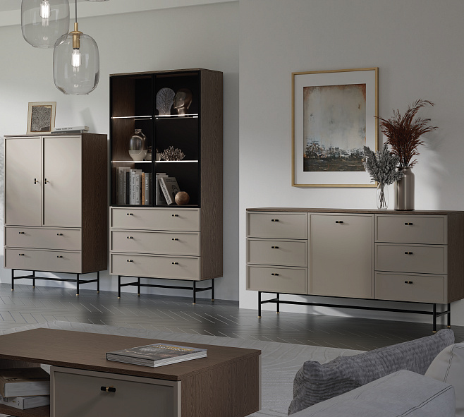 ELORA systémový nábytek do obývacího pokoje. Vkusný, jednoduchý, elegantní. Moderní nábytek do obývacího pokoje ELORA vyniká nadčasovým, minimalistickým designem, který dokonale splňuje náročné interiérové požadavky. Hladké linie a jedinečná kombinace barevného provedení baltic storm a toffi vytvářejí silný dekorativní prvek. Široké možnosti uspořádání, které tato sada nábytku do obývacího pokoje nabízí, jí dodávají všestranný a univerzální charakter, který se hodí do moderních i klasických interiérů. Výběr nábytku není určen pouze jeho vzhledem, ale také jeho funkčností. Moderní sektorový nábytek do obývacího pokoje ELORA je vyroben z vysoce kvalitních materiálů, což zaručuje jeho trvanlivost, pevnost a vysokou odolnost proti poškození. Poskytuje dostatek úložného prostoru, pomáhá optimalizovat a pohodlně organizovat prostor a přizpůsobuje se Vašim individuálním potřebám.