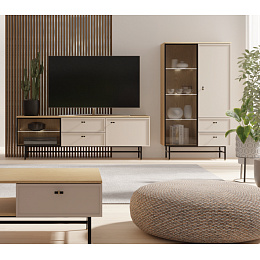 ELORA systémový nábytek do obývacího pokoje. Vkusný, jednoduchý, elegantní. Moderní nábytek do obývacího pokoje ELORA vyniká nadčasovým, minimalistickým designem, který dokonale splňuje náročné interiérové požadavky. Hladké linie a jedinečná kombinace barevného provedení dub jarní a macadamia vytvářejí silný dekorativní prvek. Široké možnosti uspořádání, které tato sada nábytku do obývacího pokoje nabízí, jí dodávají všestranný a univerzální charakter, který se hodí do moderních i klasických interiérů. Výběr nábytku není určen pouze jeho vzhledem, ale také jeho funkčností. Moderní sektorový nábytek do obývacího pokoje ELORA je vyroben z vysoce kvalitních materiálů, což zaručuje jeho trvanlivost, pevnost a vysokou odolnost proti poškození. Poskytuje dostatek úložného prostoru, pomáhá optimalizovat a pohodlně organizovat prostor a přizpůsobuje se Vašim individuálním potřebám.