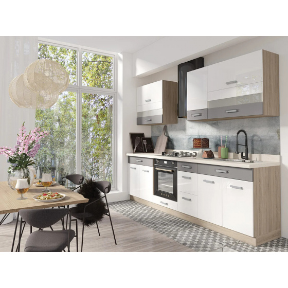 Kuchyňské skříňky jsou dodávány v demontu s návodem k montáži, bez dřezu, vodovodní baterie, spotřebičů a dekorací