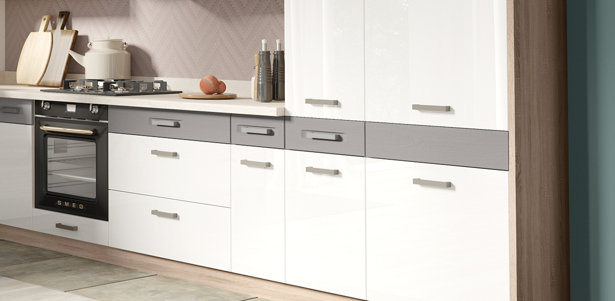 BASIC - základní provedení - šuplíky s válečkovými pojezdy GTV metalbox a kovovými bočnicemi. Výklopná dvířka s plynovými písty. Tlumiče pro tiché dovírání. Závěsy skříněk se zpomalovačem. Výškově regulovatelné spodní nožky. Nastavitelný závěs pro horní skříňky.