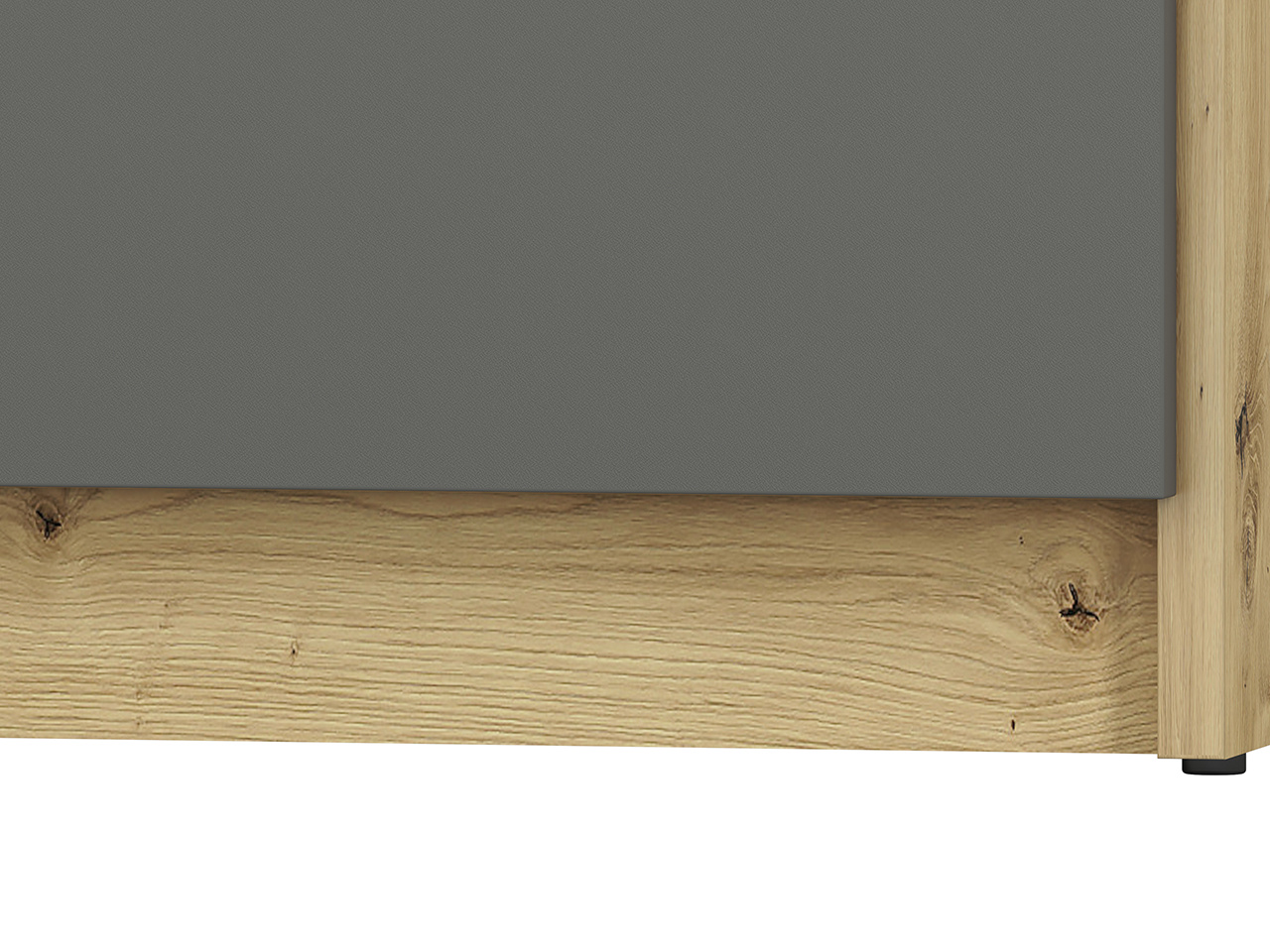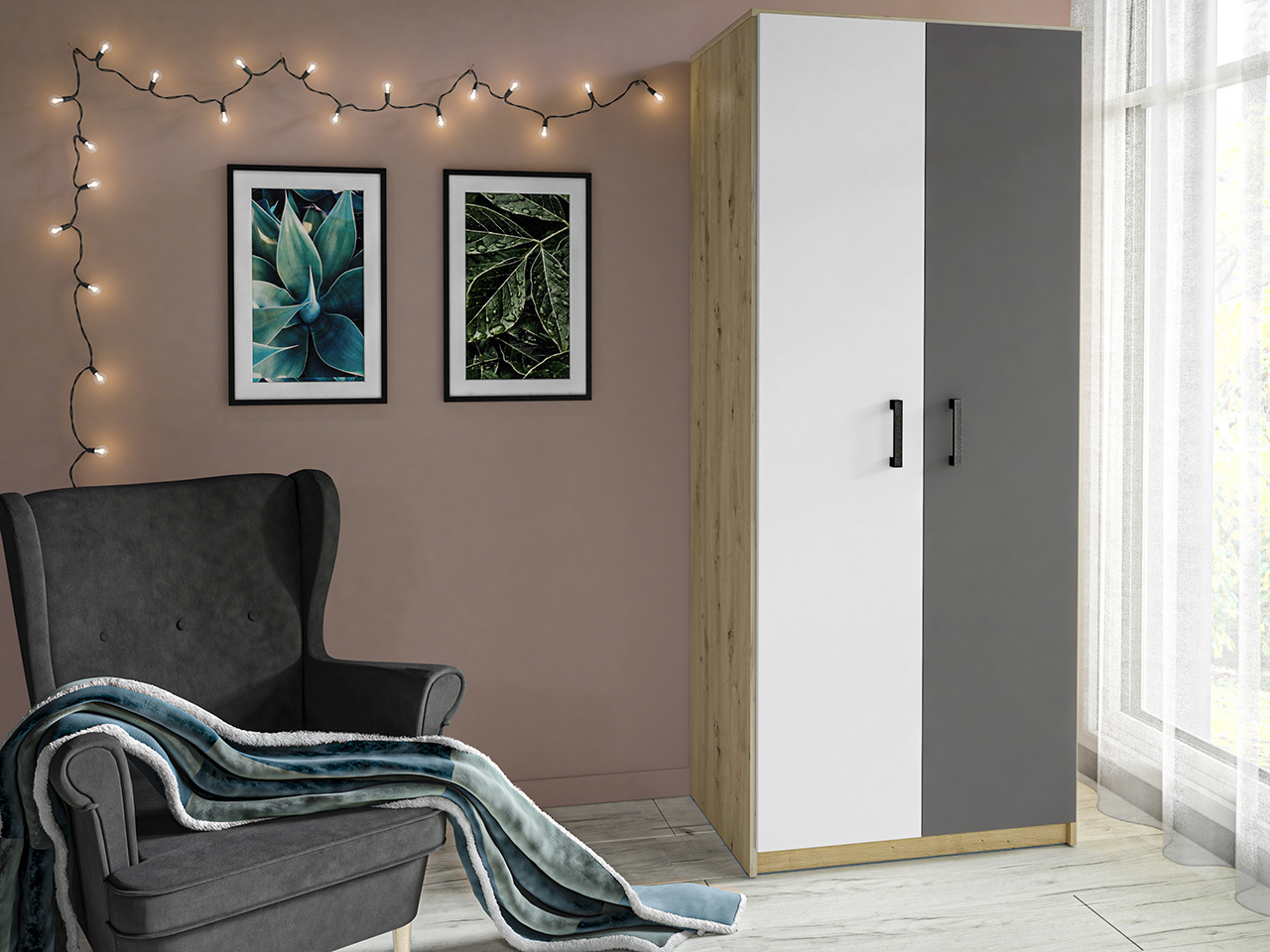 Systémový studentský a dětský nábytek FINI je složen z originálních, jednoduchých tvarů v módních dekorech. Sektor je vyroben z kvalitního lamina. Korpus v dekoru dub artisan je doplněn bílou a antracitem na dvířkách a čelech šuplíků. Barevné ladění čelních ploch a korpusu vytváří mladistvý efekt a eleganci. Kontrastní černé úchytky jsou tečkou na jedinečnosti nábytku FINI.