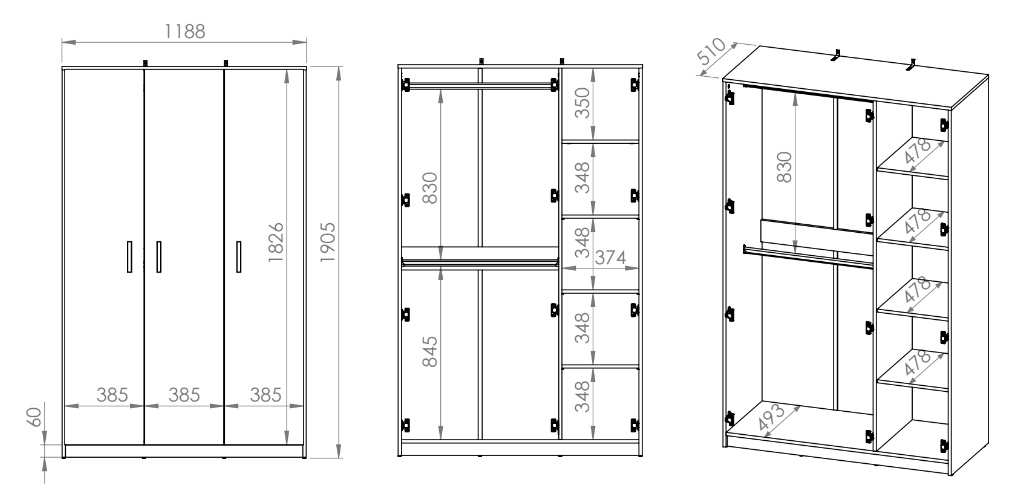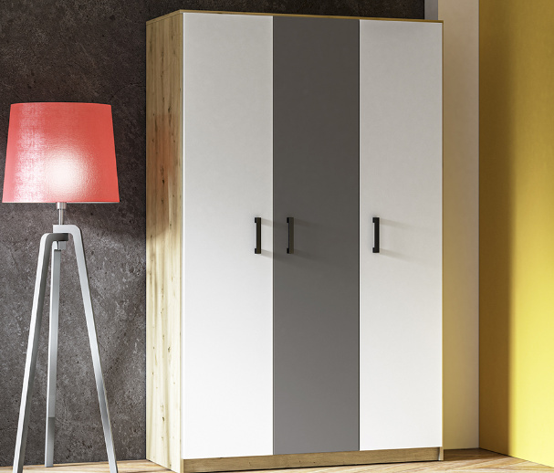 FINI 02 šatní skříň - trojdveřová, kombinovaná s policemi a šatními tyčemi nad sebou