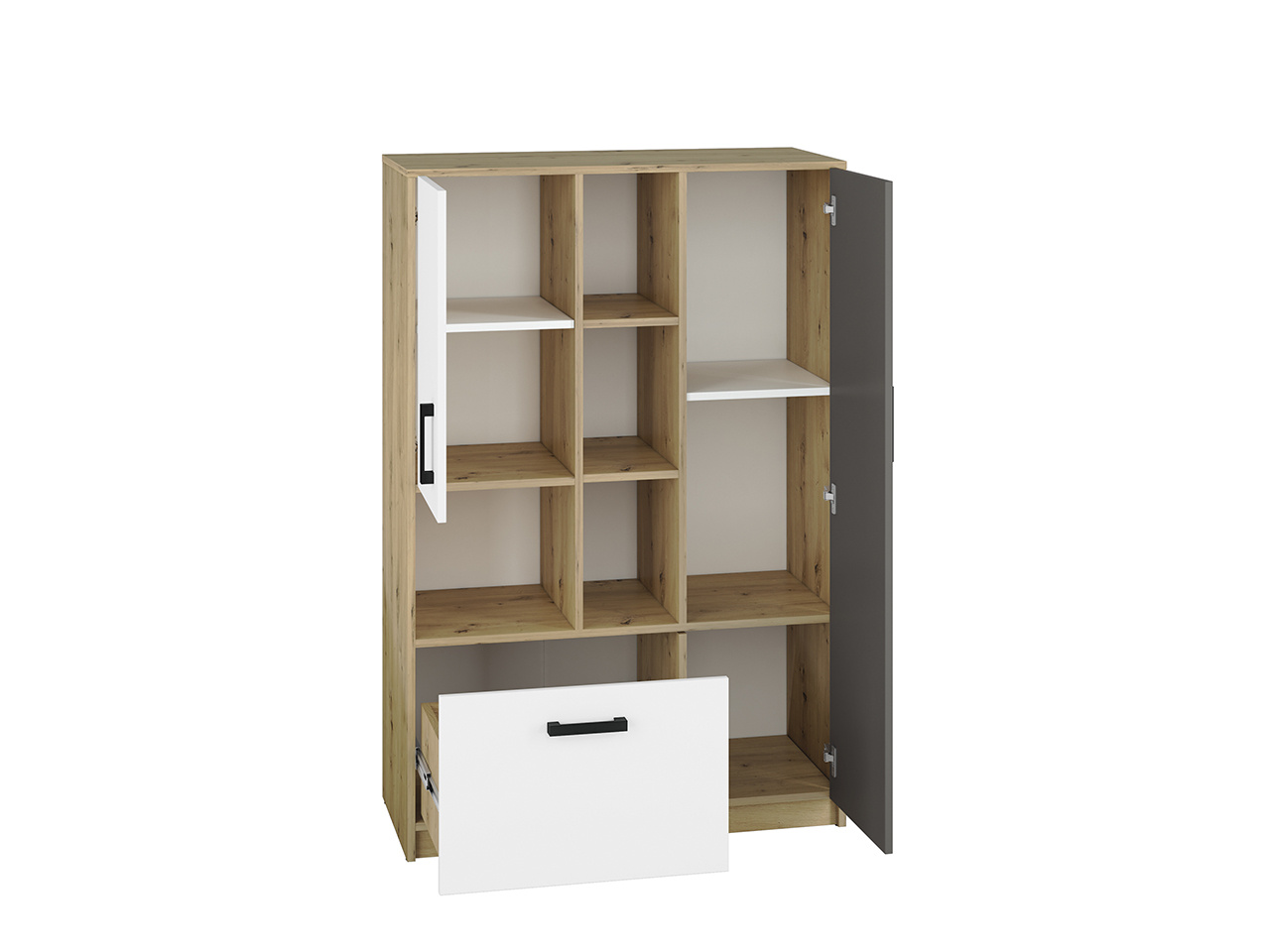 FINI 05 komoda - policová, částečně uzavřená plnými dvířky, s objemným šuplíkem dole