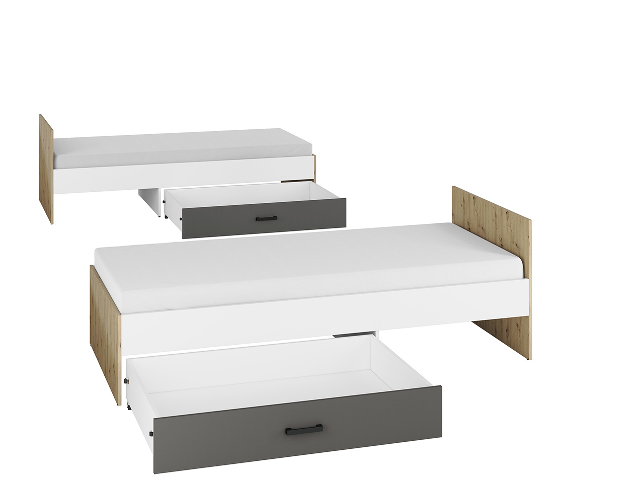 Systémový studentský a dětský nábytek FINI je složen z originálních, jednoduchých tvarů v módních dekorech. Sektor je vyroben z kvalitního lamina. Korpus v dekoru dub artisan je doplněn bílou a antracitem na dvířkách a čelech šuplíků. Barevné ladění čelních ploch a korpusu vytváří mladistvý efekt a eleganci. Kontrastní černé úchytky jsou tečkou na jedinečnosti nábytku FINI.